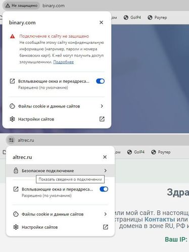 Чтобы узнать, есть ли сертификат, можно взглянуть на адресную строку браузера. В её левом углу вы должны увидеть значок, нажав на который появится окно сведений о сайте. В его верхней строке – закрытый замок и надпись «Безопасное соединение — значит, у сайта имеется сертификат и на нём безопасно. Если же подключение осуществляется по незащищённому протоколу HTTP, то браузер вас об этом предупредит.