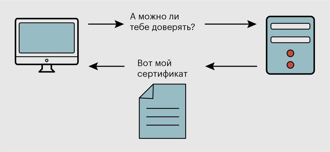 - Браузер пользователя уточняет у сервера сайта, подлинный ли он.