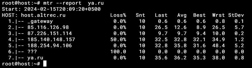 Кроме того, mtr можно запустить с опцией –report, которая вернет результаты отправки 10 пакетов на каждый хоп