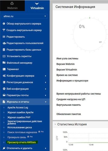 На панели выбираем Журналы и отчёты → Просмотр отчёта AWStats.