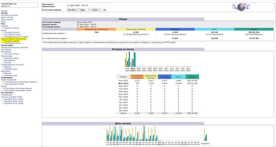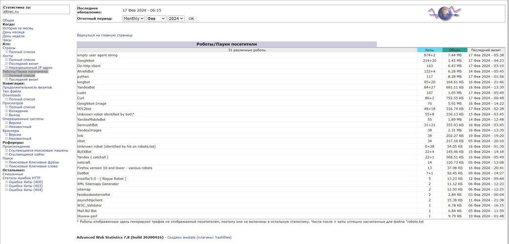 В нём выбираем Роботы/Пауки посетители → Полный список и получаем всех ботов посещающих наш сайт: